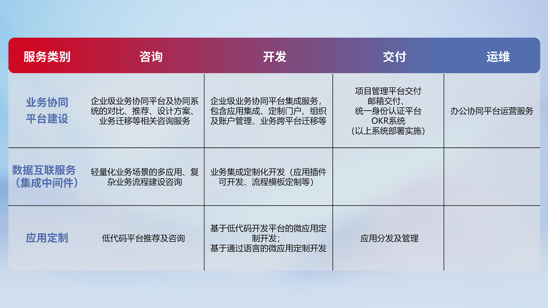 针对钉钉、、企微、、、IDaas等平台级产品提供产品的规划、、、、方案、、、、交付、、、、定制化开发等服务,,实现如统一协同办公、、智能客户服务、、混合会议管理、、、智能数据查询、、等业务场景,,,实现数字化转型。。。
