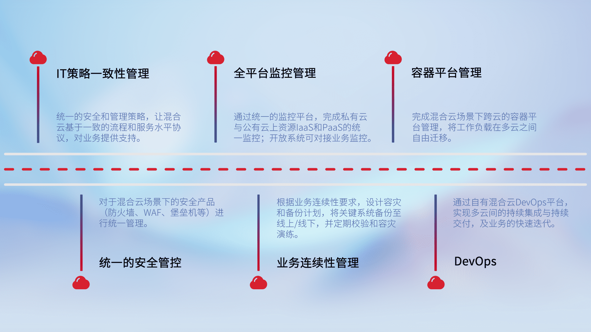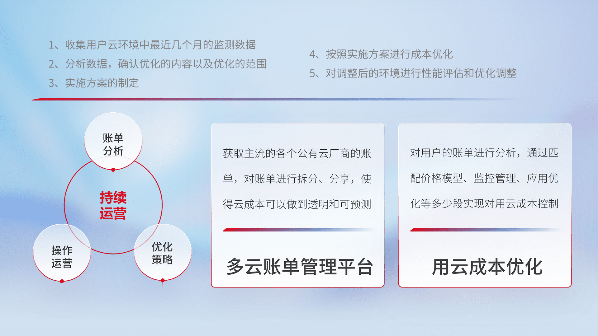 通过多云纳管,,以统一的资源数据模型把客户的云资源进行抽象和封装,,进而实现对多云资源的统一操作,,,,保障云资源管理的可靠性、、、、稳定性与可用性。。。量身定制化运维内容,,,配置、、开发运维、、补丁管理、、备份、、监控、、、认证和访问管理、、、审计和日常巡检等,,保障在用云过程中的可靠度,,,稳定度以及高可用率。。。。