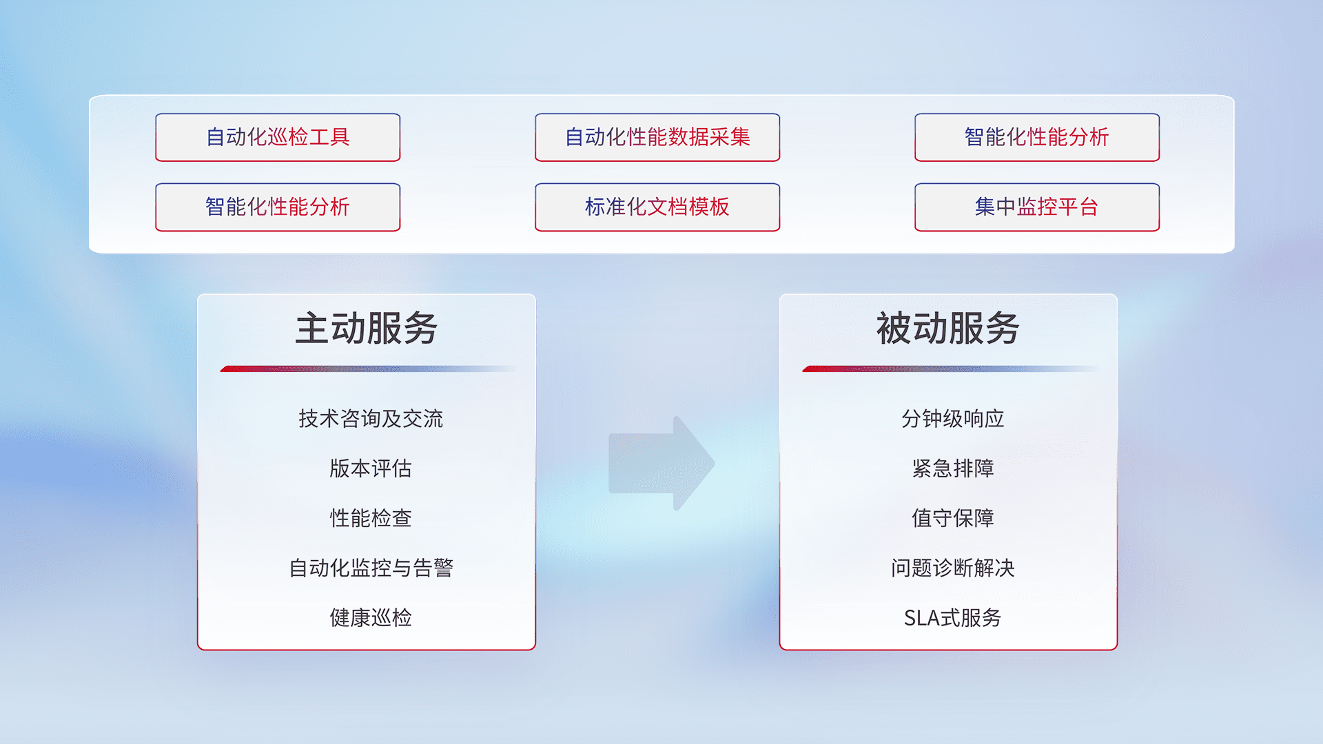 智能化工具和标准化文档,,,,保障服务质量,,提供主动服务(包含技术咨询、、、、版本评估、、、、性能检查、、、自动化监控与告警、、、健康巡检)和被动服务包含(分钟级响应、、、、紧急排障、、、、值守保障、、、、问题诊断解决、、、SLA服务)。。