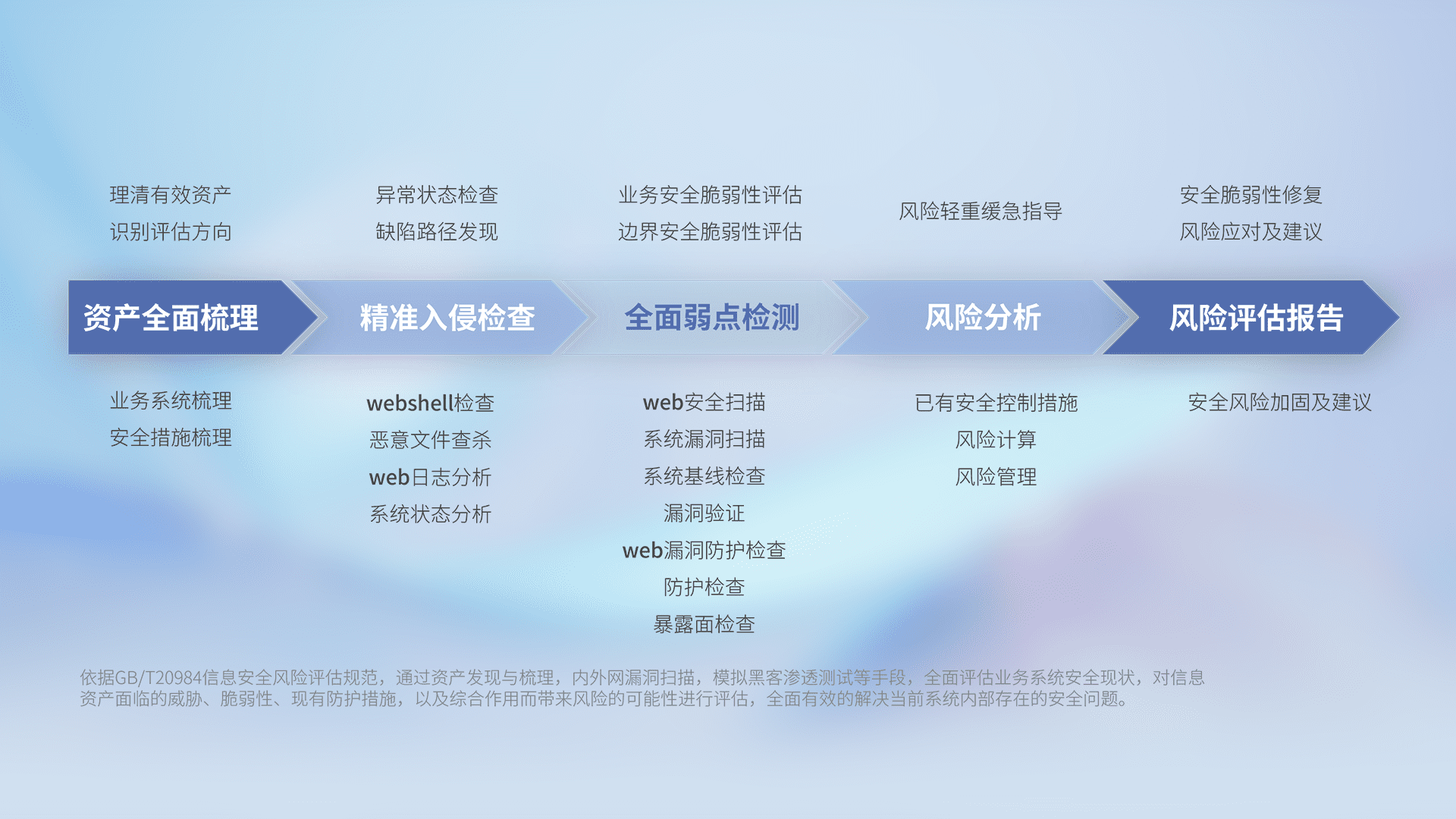 针对客户行业特性,,,,以专业的安全服务+多厂商联合解决方案提供专属的一站式安全管理服务,,帮助客户全面感知网络空间威胁,,基于识别、、、、检测、、分析、、、、防护、、监测、、、、响应的服务理论模型,,,从方案咨询、、、集成交付、、、、评估验证、、、、优化加固、、、运维运营,,,,致力于为客户提供完整的闭环管理式安全服务。。。以实战经验为客户打造高抵御风险的安全体系,,,帮助客户发现威胁、、、、对抗威胁、、处置威胁,,不断积累安全对抗能力,,持续保障数字化安全。。